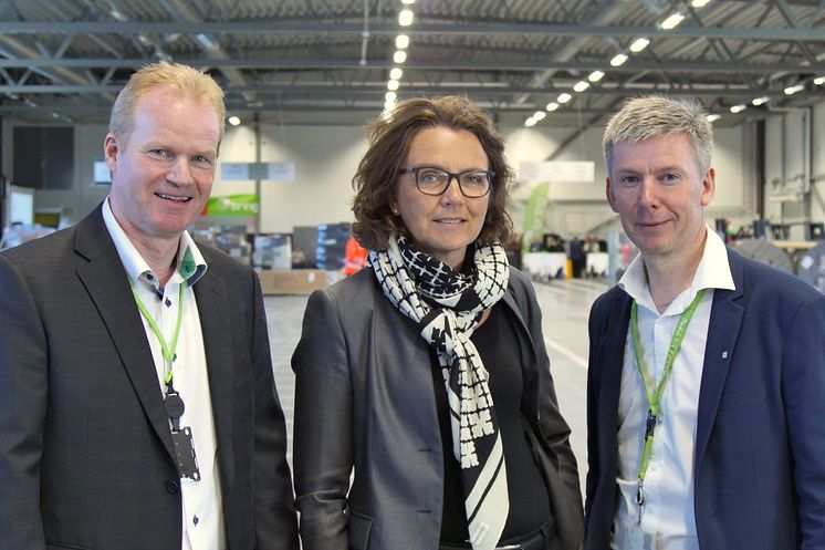Konsernsjef Tone Wille i Posten Norge stod for den offisielle åpningen av logistikksenteret. Her flankeres hun av regiondirektør Per Ivar Tiller (til venstre) og distriktssjef Karl Henrik Karlsen.