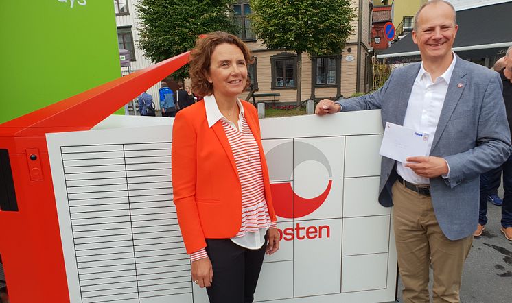 Konsernsjef Tone Wille i Posten skrev den historiske brevet som samferdselsminister Ketil Solvik-Olsen kunne hente ut fra verdens første selvgående brev -og pakkerobot.