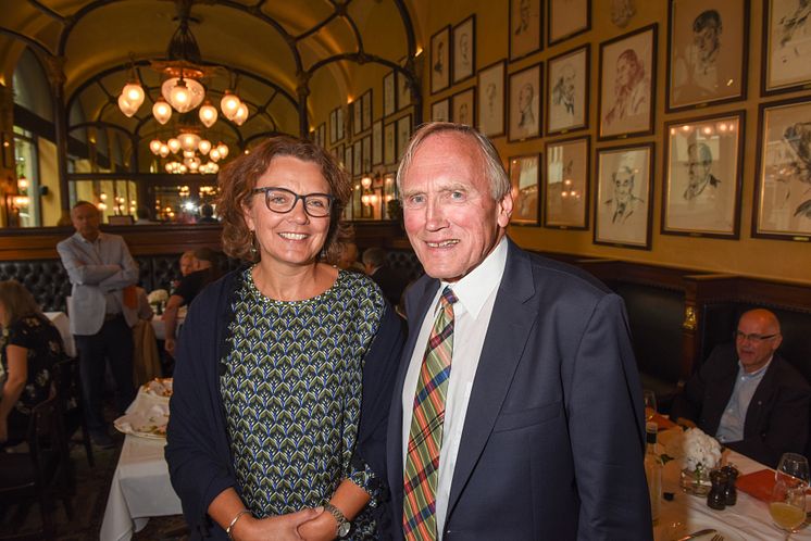 Konsernsjef Tone Wille i Posten takket Sverre Morken for hans innsats som frimerkekunstner under en mottakelse denne uken. Foto: Birger Morken