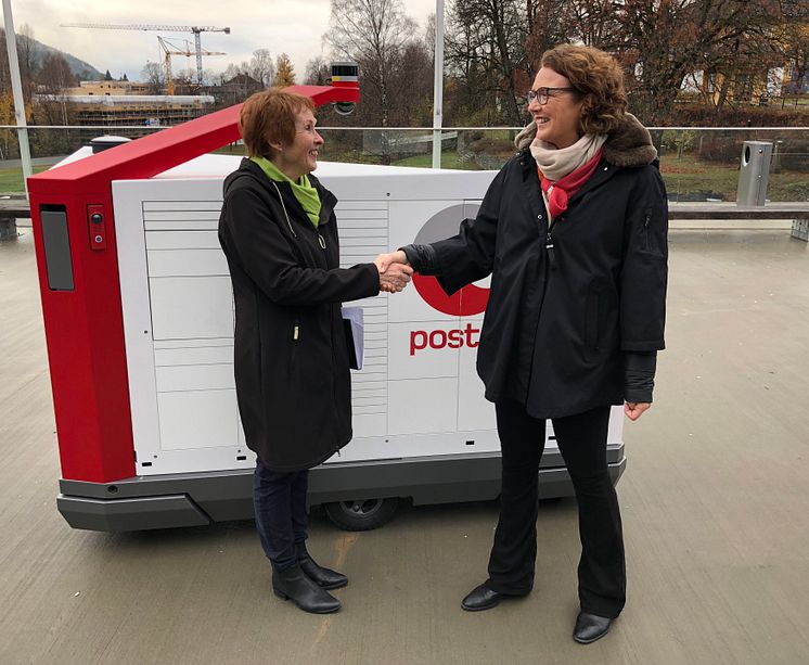 Ordfører Kari Anne Sand (til venstre) og konsernsjef Tone Wille i Posten ser fram til samarbeid om det som kan bli en del av fremtidens postlevering.