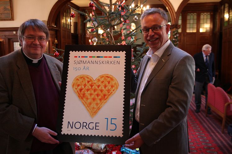 VAKKER KIRKE: Sjømannskirken på St. Olavs Square i London er vakker. Torbjørn Holt (til venstre) og frimerkedirektør Halvor Fasting viser fram det nye frimerket i kirkerommet. Foto: Jørn Michalsen