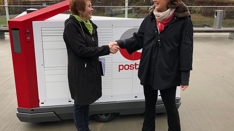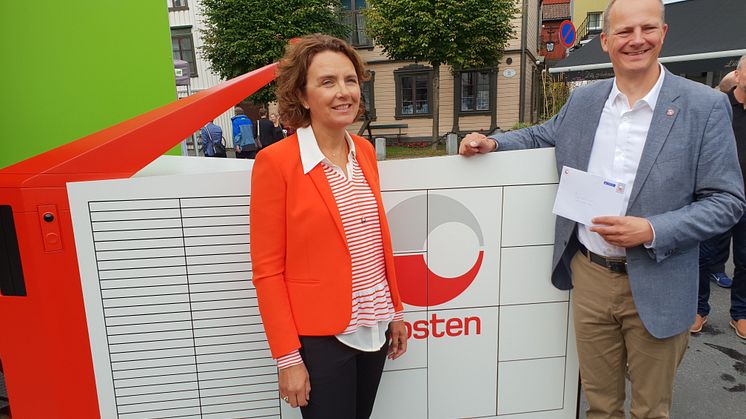 Konsernsjef Tone Wille i Posten skrev den historiske brevet som samferdselsminister Ketil Solvik-Olsen kunne hente ut fra verdens første selvgående brev -og pakkerobot.