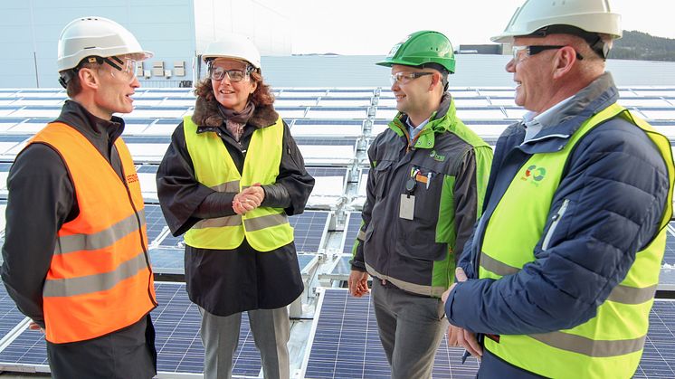 Toppmøte på taket. F.v.: Administrerende direktør Nils Kristian Nakstad i Enova, konsernsjef Tone Wille, prosjektleder Ingar Norvik og distriktssjef Leif Ivar Skjærvik i Posten Norge. FOTO: Tore Oksnes / Posten