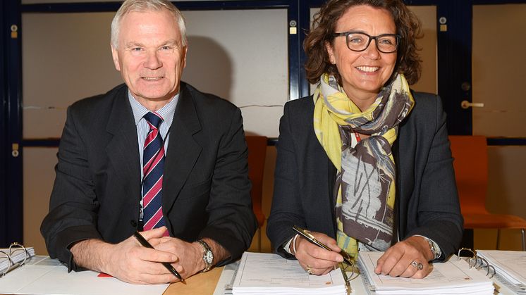 Administrerende direktør Petter Jansen i FLO og konsernsjef Tone Wille i Posten signerte kontrakten som gjør at Brings medarbeidere i fremtiden skal samarbeide med Forsvarets personell. Foto: Birger Morken, Posten