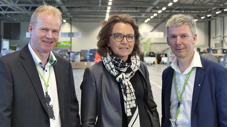 Konsernsjef Tone Wille i Posten Norge stod for den offisielle åpningen av logistikksenteret. Her flankeres hun av regiondirektør Per Ivar Tiller (til venstre) og distriktssjef Karl Henrik Karlsen.