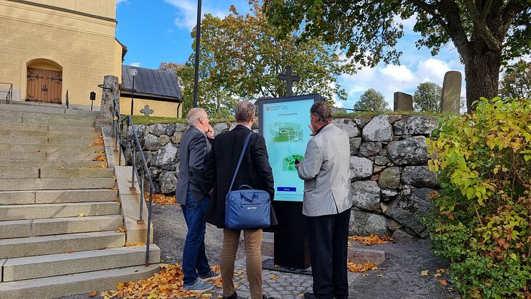 Turinge kirkes nye digitale medarbeider viser frem til riktig gravplass på det digitale kartet.