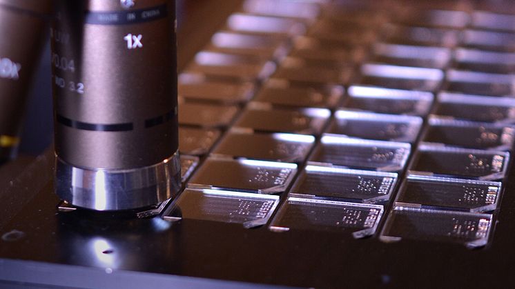 Etter et innledende trinn med for-etsing for å rense filmene, settes noen av dem til side for å testes. Vi plasserer dem under mikroskopet for å telle antallet alfaspor som allerede finnes på filmen. Målet er å kontrollere kvaliteten på den leverte råvaren. Antall spor som måles må være under en viss verdi, slik at filmene fra samme parti kan plasseres på samlebåndet.
