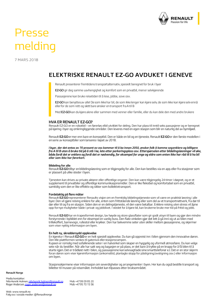 Renault EZ-GO representerer Renaults visjon om en fremtidig bildelingstjeneste som vil være en praktisk løsning i alle byer. Den vil gjøre reising enklere for alle, enten som frittstående løsning eller som del av et transportnettverk, fra dør til dør eller til og fra en stasjon. Siden den er en delingstjeneste, vil den være betalbar.