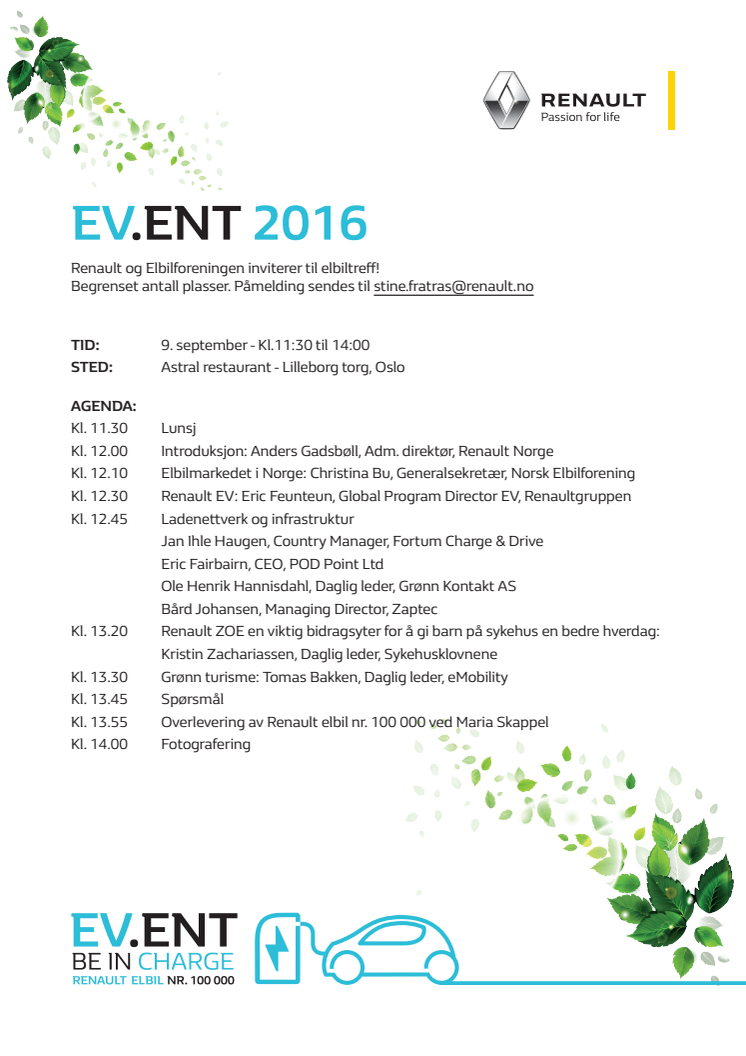 Renault i samarbeid med Elbilforeningen inviterer til elbiltreff fredag 9. september.