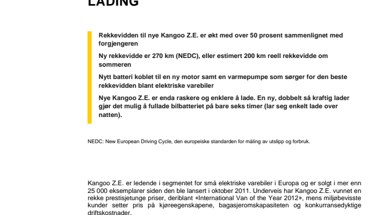 Kangoo Z.E. er ledende i segmentet for små elektriske varebiler i Europa og er solgt i mer enn 25 000 eksemplarer siden den ble lansert i oktober 2011. Underveis har Kangoo Z.E. vunnet en rekke prestisjetunge priser, deriblant «International Van of the Year 2012», mens miljøbevisste kunder setter pris på kjøreegenskapene, bagasjeromskapasiteten og konkurransedyktige driftskostnader.