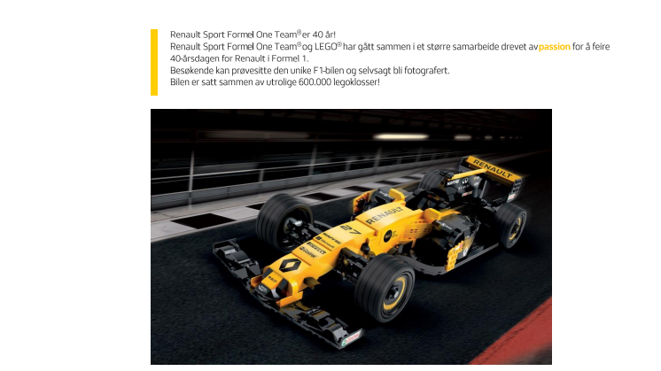 "For mange er F1 en drømmeverden som bara kan oppleves på TV. På Renault Formel 1 Team er vårt motto å gjøre det umulige mulig, noe vi streber etter i alt vi gjør". LEGO® som er kjent for de fleste har gitt oss sjansen til å åpne døren til F1-verden. L'Atelier Renault, Renaults internasjonale showroom, der passion blir til virkelighet, har ordnet den her aktiviteten, som blander kreativitet og moro. Vi er stolte av resultatet".