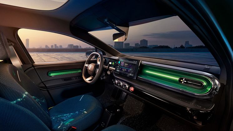 Dashbordet til Twingo E-Tech er både designmessig stilig og funksjonelt. Med et 7-tommers digitalt instrumentpanel og en 10,1-tommers midtstilt multimediaskjerm. Interiøret er smart designet med en strømlinjeformet utforming som inneholder flere lett tilgjengelig oppbevaringsplasser. Det er plass under dashbordet og de to forsetene til å oppbevare bag`er og små gjenstander.