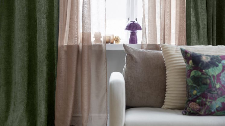 Naturmaterialer som ull, bomull og lin er her for å bli. Dette er synlig blant Rustas interiørnyheter som finnes i varehusene i august. Grunnfargene beige og naturhvit får selskap av olivengrønn, dyp lilla, brent oransje og brun – farger som bidrar til å skape en hjemmekoselig følelse. Autumn leaves, Botanica og Dahlia er navn på noen av de nye mønstrene på Rustas tekstilavdeling, som alle flørter med naturen og dens motiver. Det fløyelsmyke materialet chenille gjør et comeback og kan sees på både puter og gardiner. I teppeavdelingen kommer flere spennende nyheter, hvor Frances-modellen med høy og lav lugg i beige eller hvit spås til å bli en skikkelig favoritt.