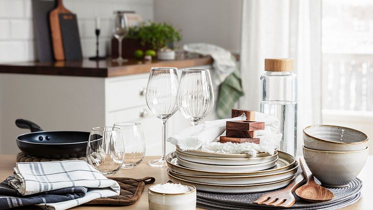 Rustas kjøkkenavdeling får tilskudd i form av rustikke støpejernsgryter og en stekepanne i trendy beige. Den nye glasserien Plissé, med drikke-, vin- og champagneglass, kommer i en prisgunstig 4-pakning. For hjemmekokken utvides sortimentet med et stilig forkle i canvas med skinndetaljer.