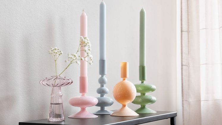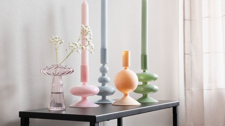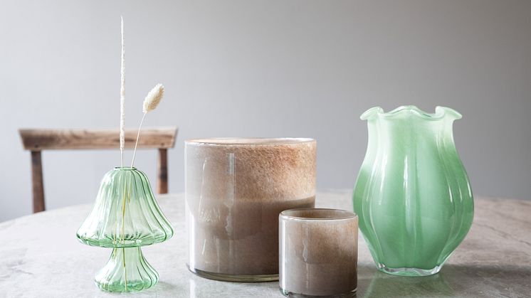 Den populære Cleo-serien utvides med en ferskenfarget modell, og får selskap av Drew, lave lyslykter – perfekte å kombinere med lysestaken Bonnie i nye farger. Skulpturelle glassvaser og søte, soppformede minivaser gjør det enkelt å fornye interiøret uten å tømme lommeboken. Komplimenter med tørkede kvister i form av selje, dekorativt gress og magnolia.
