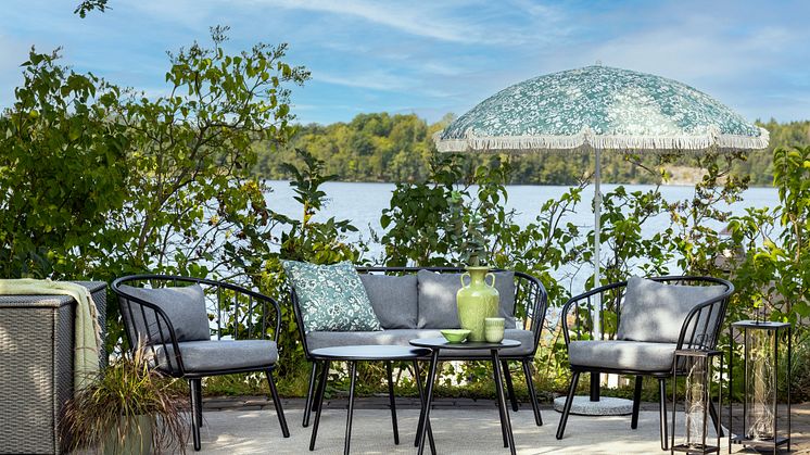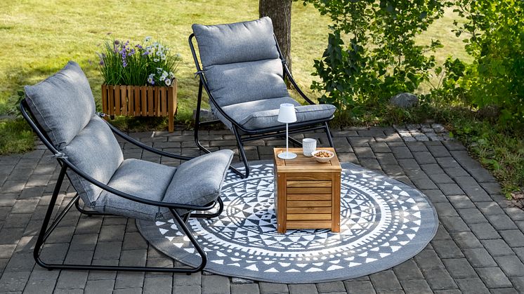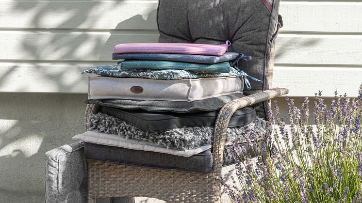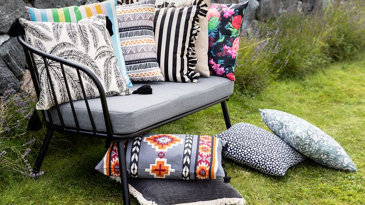Å bytte sitteputer eller legge til noen mønstrede uteputer i lounge-sofaen er en rimelig måte å friske opp de eksisterende utemøblene på. Hos Rusta finner du et bredt utvalg av tekstilnyheter, der alle puter og sitteputer for utendørs bruk er OEKO-TEX-sertifiserte. Grafiske motiver, sitroner, blomster og striper er noen av mønstrene som blir trendy i sommer.
