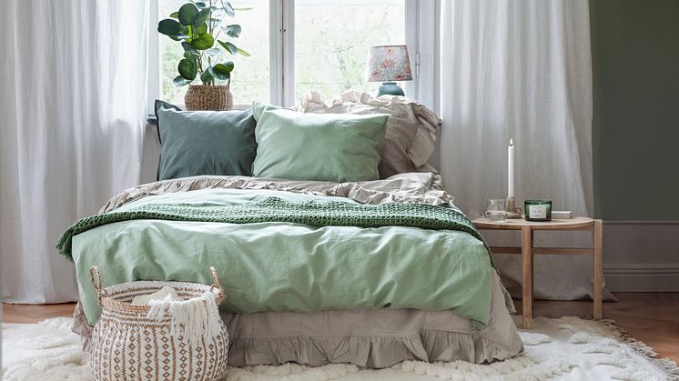 Sengeavdelingen får besøk av flere nye mønsterbilder, med sengesett i både bomull og lin. Rusta fortsetter med å øke utvalget av produkter produsert i bærekraftige materialer. 95% av all bomull på interiøravdelingen er nå BCI-sertifisert.