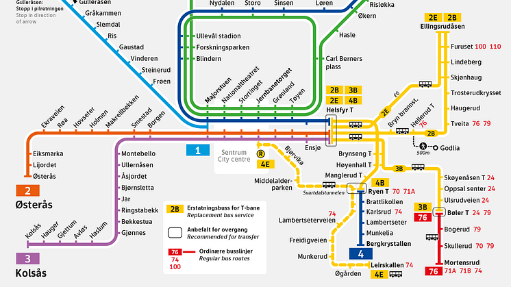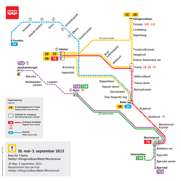 T-banens linje 2 erstattes med buss i hele perioden fra 18. mai til 3. september. Det settes opp to busslinjer. Linje 2B kjører Helsfyr – Ellingsrudåsen via Tvetenveien og Tveita, mens linje linje 2E kjører Helsfyr – Ellingsrudåsen via E6 og første stopp Skjønnhaug.