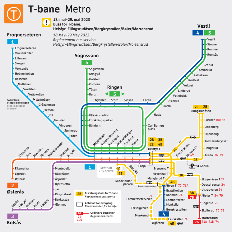 T-banens linje 4 erstattes med buss fra 18. til 29. mai. Det settes opp to busslinjer i tidsrommet hvor T-banen er stengt. Linje 4B kjører mellom Helsfyr og Ryen. Linje 4E kjører direkte mellom Jernbanetorget og Leirskallen