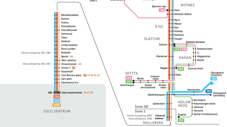 397 Skillebekk - Gjelleråsen - Skytta (ettermiddagsrush): Linjen erstatter 396 og vil kjøre i ettermiddagsrushet. Linjen gir god overgang fra 380, 390 og 390E til Skillebekk og Tokerudbekken og opp bakkene mot Holumskogen. Fra Gjelleråstoppen gir denne linjen et nytt reisetilbud fra holdeplasser på linje 380, 385, 390 eller 390E og videre til Skytta.