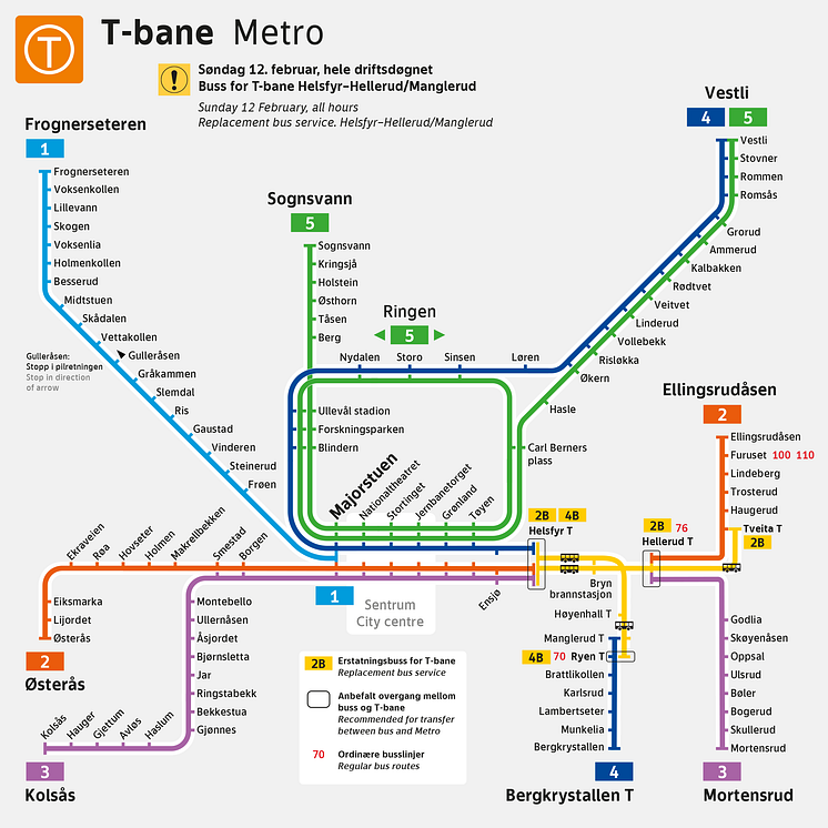 - Linje 2: T-banen kjører mellom Østerås og Helsfyr. Buss 2B erstatter T-banen mellom Helsfyr plattform G og Hellerud/Tveita. Overgang mellom buss og T-bane på Hellerud. T-banen kjører mellom Hellerud og Ellingsrudåsen.