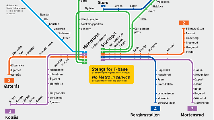 Linje 2: T-banen kjører mellom Østerås og Majorstuen. Det er nye avgangstider på denne strekningen. Det er innstilt mellom Majorstuen og Stortinget. T-banen kjører mellom Stortinget (spor 3) og Ellingsrudåsen.