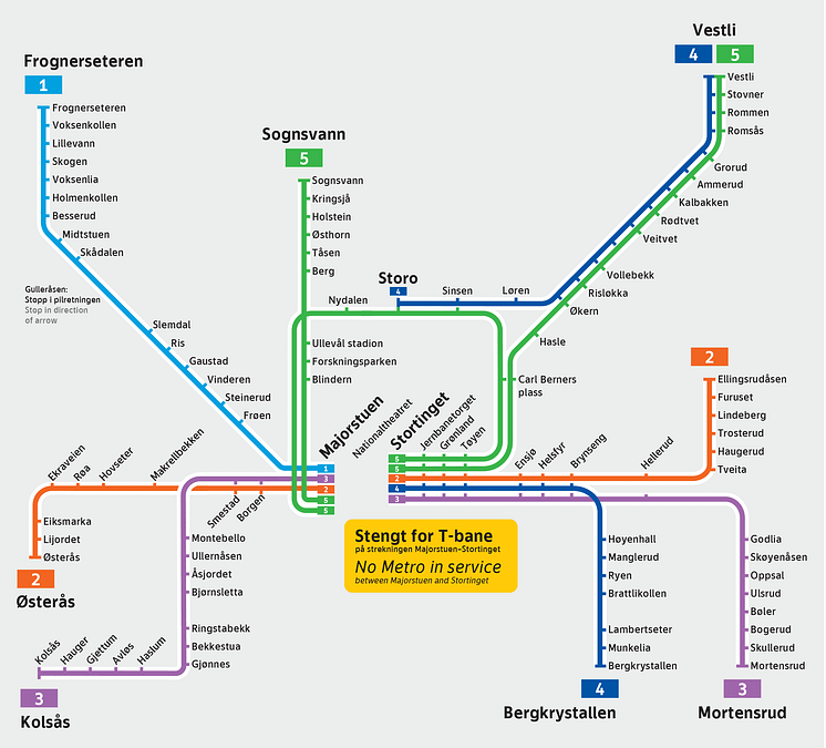 Linje 5: Kjører mellom Sognsvann og Majorstuen. Det er nye avgangstider på denne strekningen. Kjører mellom Majorstuen og Stortinget via Storo–Nydalen–Sinsen. Innstilt mellom Majorstuen og Stortinget via Nationaltheatret. Kjører mellom Stortinget (spor 3) og Vestli.