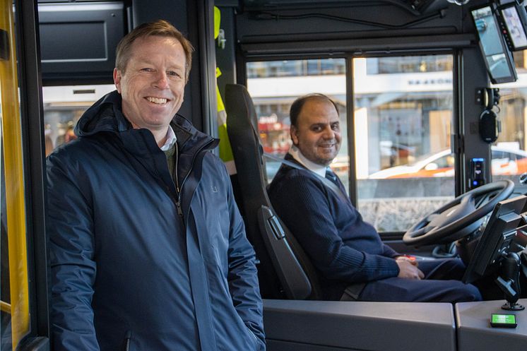 – Med nesten en dobling av antall elbusser i Oslotrafikken er det nærmest en stille revolusjon på vei mot målet om utslippsfri kollektivtrafikk. I tillegg til bærekraftperspektivet får passasjerene en bedre hverdagsopplevelse med mindre støy og uten dieseleksos på holdeplassene, sier administrerende direktør i Norgesbuss Atle Rønning (bilde under sammen med bussjåfør Amin Muhammad).