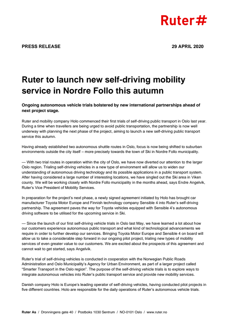 Ruter og mobilitetsselskapet Holo samarbeider om utprøvning av selvkjørende kollektivtransport i Oslo-regionen. I en tid hvor kollektivreiser frarådes av smittevernhensyn jobber de to partene for fullt med å forberede Ruters neste selvkjørende reisetilbud, som etter planen skal rulles ut i løpet av høsten.