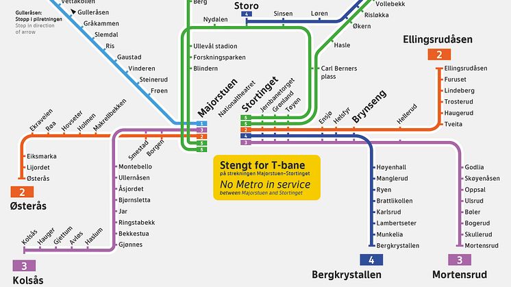 - T-banen kjører mellom Majorstuen og Stortinget via Storo.
