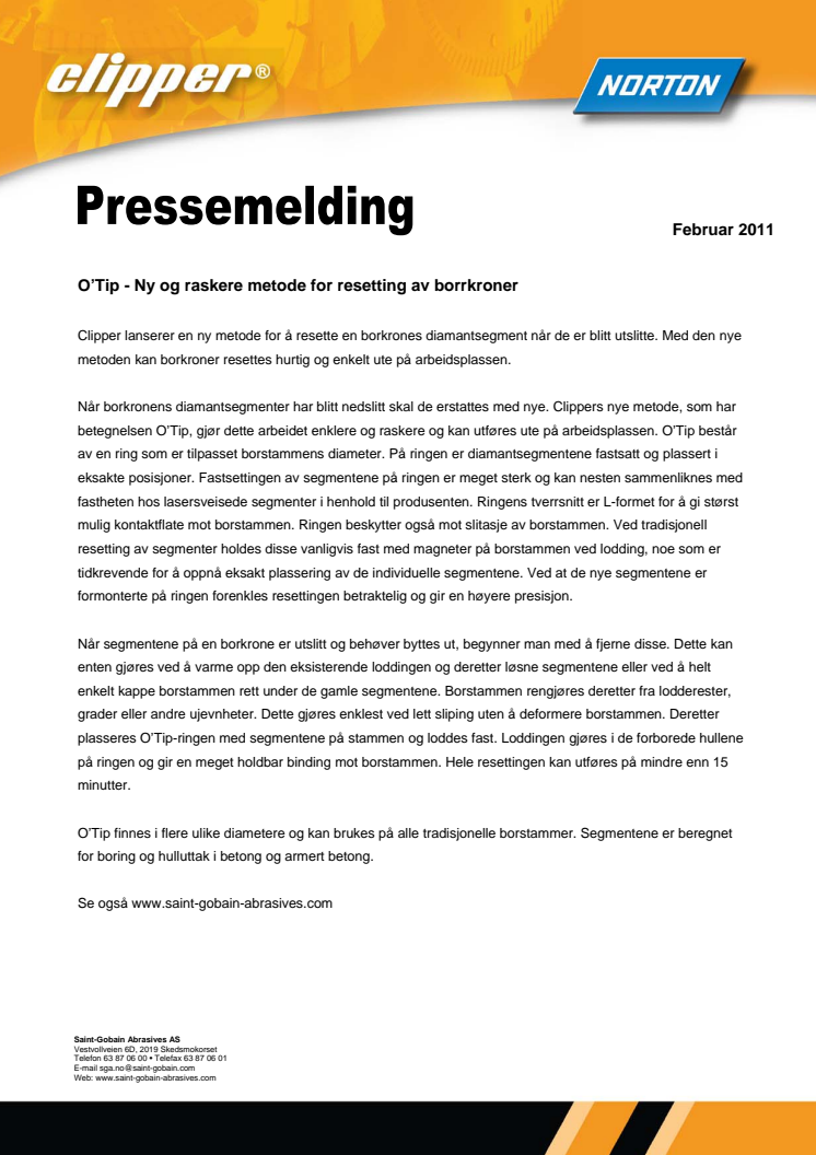Clipper lanserer en ny metode, O'Tip, for å resette en borkrones diamantsegment når de er blitt utslitte. Med den nye metoden kan borkroner resettes hurtig og enkelt ute på arbeidsplassen.