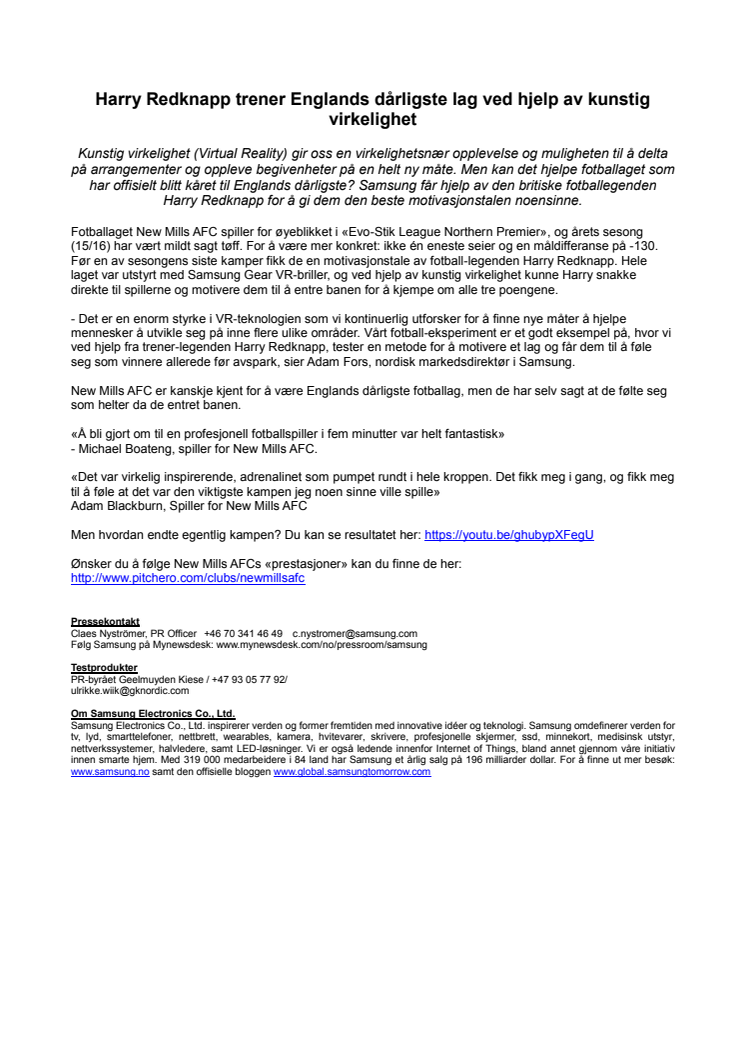 Kunstig virkelighet (Virtual Reality) gir oss en virkelighetsnær opplevelse og muligheten til å delta på arrangementer og oppleve begivenheter på en helt ny måte. Men kan det hjelpe det som offisielt har blitt kåret til Englands dårligste fotballag? Samsung får hjelp av den britiske fotballegenden Harry Redknapp for å gi dem den beste motivasjonstalen noensinne.