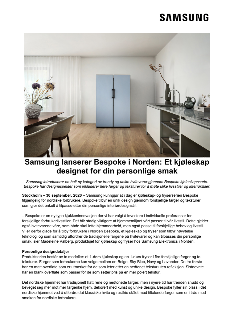 Samsung introduserer en helt ny kategori av trendy og unike hvitevarer gjennom Bespoke kjøleskapsserie. Bespoke har designaspekter som inkluderer flere farger og teksturer for å møte ulike livsstiler og interiørstiler.