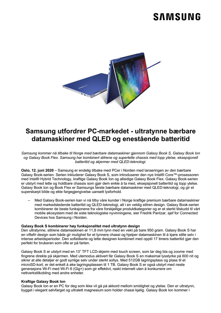 Samsung kommer nå tilbake til Norge med bærbare datamaskiner gjennom Galaxy Book S, Galaxy Book Ion og Galaxy Book Flex. Samsung har kombinert stilrene og superlette chassis med topp ytelse, eksepsjonell batteritid og skjermer med QLED-teknologi.