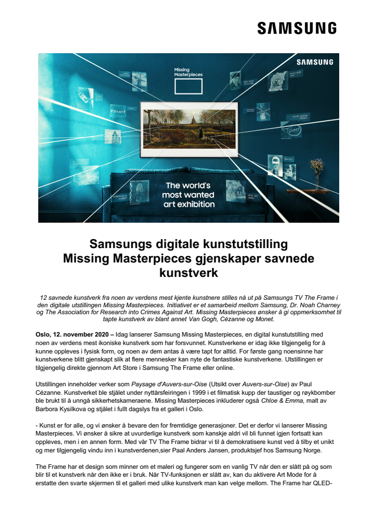12 savnede kunstverk fra noen av verdens mest kjente kunstnere stilles nå ut på Samsungs TV The Frame i den digitale utstillingen Missing Masterpieces. Initiativet er et samarbeid mellom Samsung, Dr. Noah Charney og The Association for Research into Crimes Against Art. Missing Masterpieces ønsker å gi oppmerksomhet til tapte kunstverk av blant annet Van Gogh, Cézanne og Monet