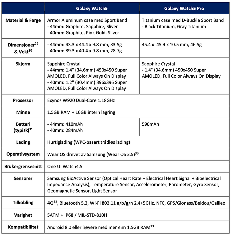 Spec Galaxy Watch5 og Watch5 Pro