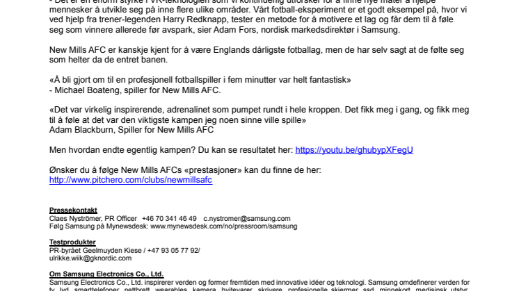 - Det er en enorm styrke i VR-teknologien som vi kontinuerlig utforsker for å finne nye måter å hjelpe mennesker å utvikle seg på innen flere ulike områder. Vårt fotball-eksperiment er et godt eksempel på, hvor vi ved hjelp fra trener-legenden Harry Redknapp, tester en metode for å motivere et lag og får dem til å føle seg som vinnere allerede før avspark, sier Adam Fors, nordisk markedsdirektør i Samsung.