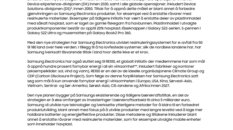 En del av den nye strategien er målet om netto null karbonutslipp i alle operasjoner innenfor Device eXperience-divisjonen (DX) innen 2030, samt i alle globale operasjoner, inkludert Device Solutions-divisjonen (DS)*, innen 2050. Tiltak for å oppnå dette målet er blant annet å forbedre gjenvinningen av Samsung Electronics produkter, for eksempel ved å erstatte råvarer med resirkulerte materialer. Eksempler på tidligere initiativ har vært å erstatte deler av plastinnholdet med såkalt havplast, som er laget av gamle fiskegarn fra havbunnen. Plastinnholdet i utvalgte produktkomponenter består av opptil 20% havplast: låseknappen i Galaxy S22-serien, S-pennen i Galaxy S22 Ultra og musematten på Galaxy Book2 Pro 360.