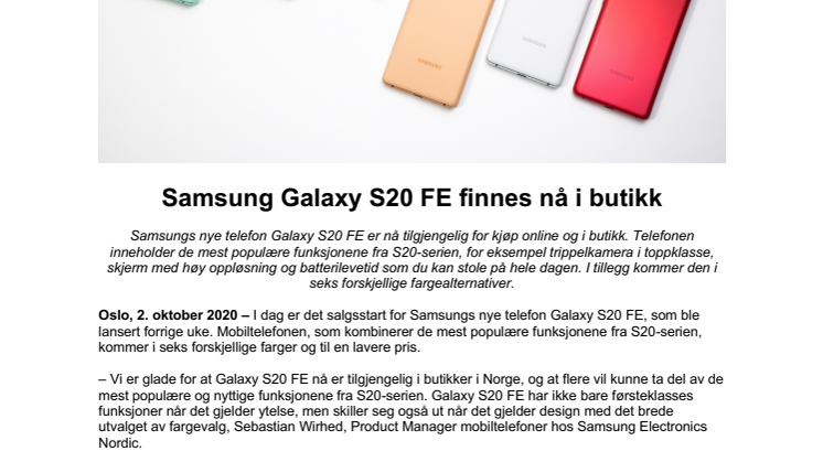 – Vi er glade for at Galaxy S20 FE nå er tilgjengelig i butikker i Norge, og at flere vil kunne ta del av de mest populære og nyttige funksjonene fra S20-serien. Galaxy S20 FE har ikke bare førsteklasses funksjoner når det gjelder ytelse, men skiller seg også ut når det gjelder design med det brede utvalget av fargevalg, Sebastian Wirhed, Product Manager mobiltelefoner hos Samsung Electronics Nordic.