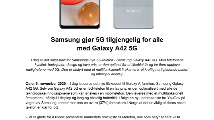 Oslo, 6. november 2020 – I dag lanseres det nye tilskuddet til Galaxy A-familien, Samsung Galaxy A42 5G. Selv om Galaxy A42 5G er en 5G-telefon til en lav pris, er den optimalisert med alle de teknologiske innovasjonene som kan ønskes i en mobiltelefon. Den leveres med et multifunksjonelt firekamera, Infinity-U display og lang og pålitelig batteritid. I følge en ny undersøkelse fra YouGov på vegne av Samsung, mener mer enn en av tre (37%) forbrukere i Norge at det er viktig at deres neste telefon er klar for 5G.