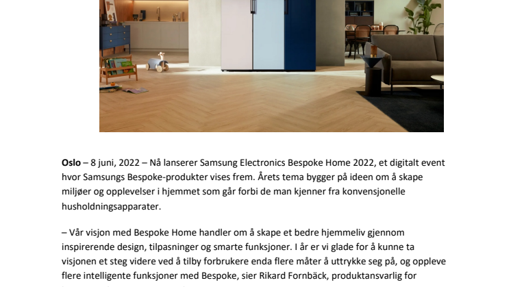 Oslo – 8 juni, 2022 – Nå lanserer Samsung Electronics Bespoke Home 2022, et digitalt event hvor Samsungs Bespoke-produkter vises frem. Årets tema bygger på ideen om å skape miljøer og opplevelser i hjemmet som går forbi de man kjenner fra konvensjonelle husholdningsapparater.