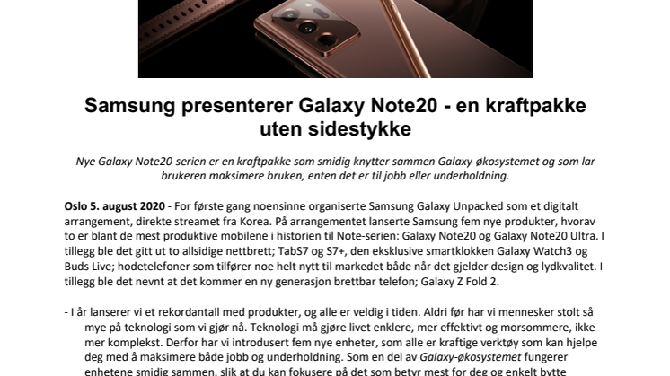 Oslo 5. august 2020 - For første gang noensinne organiserte Samsung Galaxy Unpacked som et digitalt arrangement, direkte streamet fra Korea.På arrangementet lanserte Samsung fem nye produkter, hvorav to er blant de mest produktive mobilene i historien til Note-serien: Galaxy Note20 og Galaxy Note20 Ultra.I tillegg ble det gitt ut to allsidige nettbrett; TabS7 og S7+, den eksklusive smartklokken Galaxy Watch3 og Buds Live; hodetelefoner som tilfører noe helt nytt til markedet både når det gjelder design og lydkvalitet.I tillegg ble det nevnt at det kommer en ny generasjon brettbar telefon; Galaxy Z Fold 2.