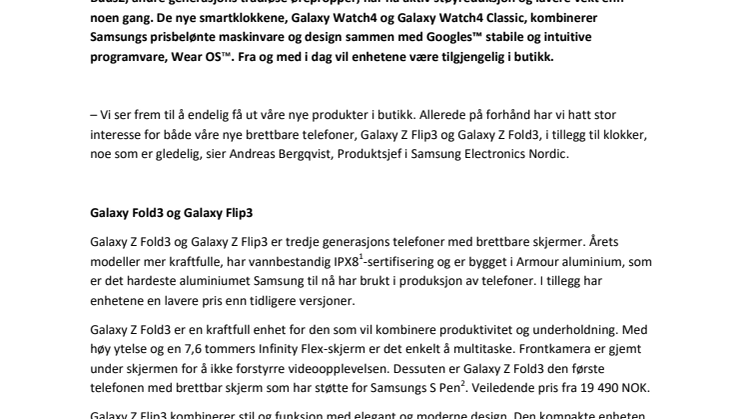 – Vi ser frem til å endelig få ut våre nye produkter i butikk. På forhånd har vi hatt stor interesse for både våre nye brettbare telefoner, Galaxy Z Flip3 og Galaxy Z Fold3, og klokker, noe som er gledelig, sier Andreas Bergqvist, Produktsjef i Samsung Electronics Nordic.