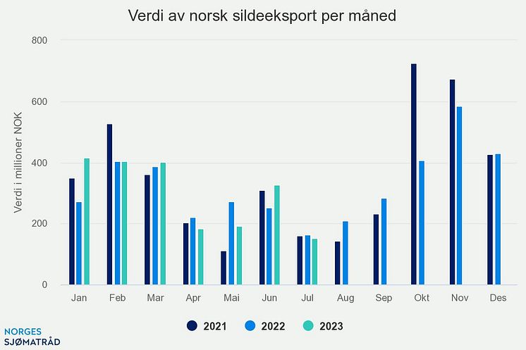 Juli 2023 Verdi av norsk sildeeksport per måned