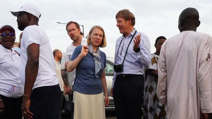 Utenriksminister Anniken Huitfelt besøker tørrfiskmarkedet White Sands, i Lagos. Her sammen med sjømatutsending Trond Kostveit