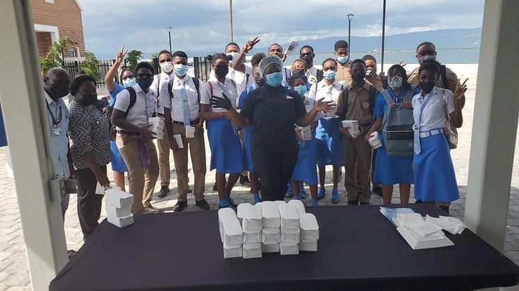 Jamaicanske studenter får smake fritert «ackee and saltfish». Her i koronatilpasset innpakning i bokser.