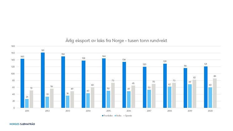 Grafen viser eksportutviklingen for laks fra Norge til Frankrike, Italia og Spania de siste ti årene (direkteeksport). I tillegg kommer det betydelige mengder norsk laks inn i disse markedene via transittland som Polen, Nederland og Danmark. Av grafen ser vi at lakseeksporten til Frankrike i snitt har ligget på rundt 136 000 tonn i året i denne perioden. I samme periode har lakseeksporten til Italia økt fra 26 000 til 60 000 tonn, mens økningen har vært fra 51 000 til 86 000 tonn til Spania. I prosent er dette en vekst på henholdsvis 130 og 69 prosent.