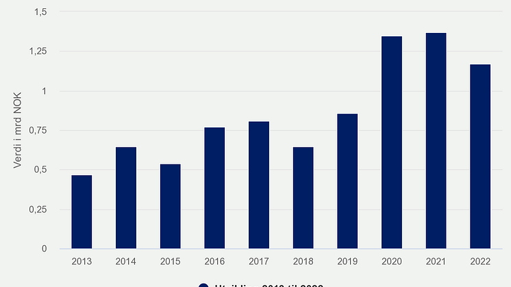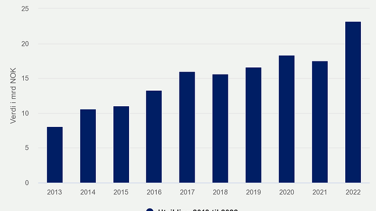 - Verdien økte med 360 millioner kroner, eller 37 prosent, sammenlignet med første kvartal i fjor. Dette er tidenes høyeste eksportverdi i et enkeltkvartal, og hele 25 prosent høyere enn forrige rekordkvartal, som var i første kvartal 2020.