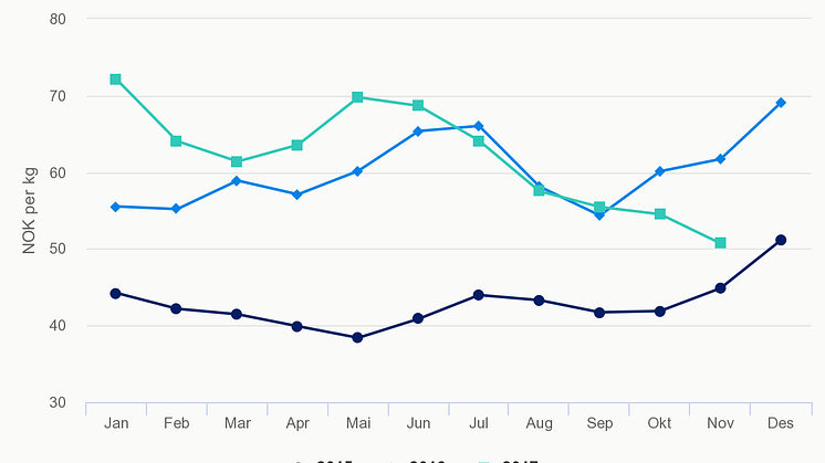 Norge eksporterte 103 000 tonn laks for 5,7 milliarder kroner i november. Det er en volumøkning på 11 prosent eller 10 200 tonn og en verdinedgang på 5 prosent eller 291 millioner kroner fra november i fjor. Hittil i år har Norge eksportert 909 000 tonn laks for 59 milliarder kroner. Det er en volumøkning på 2 prosent, mens verdien økte med 7 prosent eller 4 milliarder kroner fra samme periode i fjor. Gjennomsnittsprisen for hel, fersk laks var i november måned 50,68 kroner per kilo mot 61,71 kroner i november i fjor. Polen og Frankrike var de største markedene for laks i november.