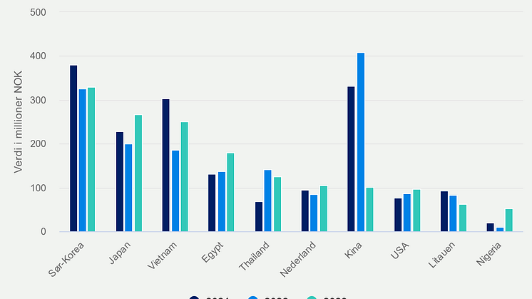 Indonesia hadde størst verdivekst denne måneden, med en eksportverdi på 1 million kroner, mot ingenting i fjor.